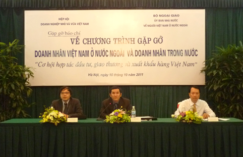 VINASME - Ngày 10/10/2011, tại Nhà khách Chính phủ số 2 Lê Thạch - Hà Nội, Hiệp hội Doanh nghiệp nhỏ và vừa Việt Nam cùng Ủy ban Nhà nước về người Việt Nam ở nước ngoài, Bộ Ngoại giao đã tổ chức buổi gặp gỡ báo chí để thông báo về Chương trình Gặp gỡ doanh nhân Việt Nam ở nước ngoài và doanh nhân trong nước "Cơ hội hợp tác đầu tư, giao thương và xuất khẩu hàng Việt Nam".