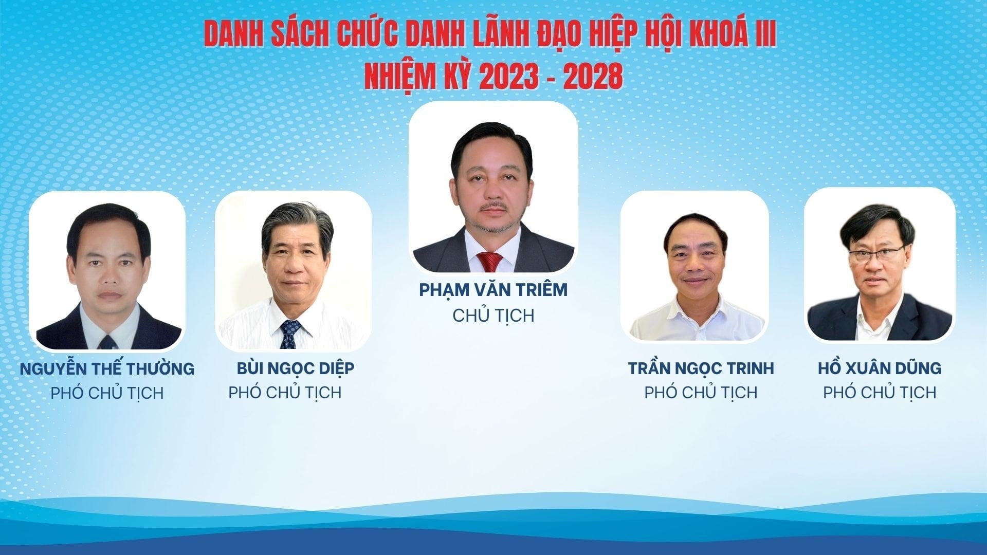 Lãnh đạo Hiệp hội gồm: Chủ tịch Phạm Văn Triêm; Phó chủ tịch thường trực Bùi Ngọc Diệp; Phó chủ tịch Nguyễn Thế Thường; Phó chủ tịch Trần Ngọc Trinh; Phó chủ tịch Hồ Xuân Dũng