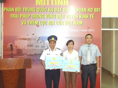 Nhân dịp này, Hiệp hội DN nhỏ và vừa Đà Nẵng cũng trao 100 triệu đồng do các DN đóng góp ủng hộ lực lượng Cảnh sát Biển và Nghiệp đoàn Nghề cá Đà Nẵng ( mỗi đơn vị 50 triệu đồng). Số tiền ủng hộ lực lượng Kiểm ngư (do bận công tác, không đến tham dự mittinh được), sẽ được Hiệp hội mang đến đơn vị trao tặng sau.