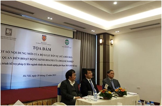 Trên tinh thần đó, trong khuôn khổ Kế hoạch năm 2015 của Chương trình hỗ trợ pháp lý liên ngành dành cho doanh nghiệp giai đoạn 2015-2020 của Bộ Tư pháp, ngày 18/12/2015, tại Hà Nội, Vụ Pháp luật dân sự - kinh tế, Bộ Tư pháp phối hợp với Hiệp hội doanh nghiệp vừa và nhỏ Việt Nam và Câu lạc bộ pháp chế doanh nghiệp tổ chức “Tọa đàm một số nội dung mới của Bộ luật Dân sự (sửa đổi) liên quan đến hoạt động kinh doanh của doanh nghiệp”. Đến tham dự và chỉ đạo Tọa đàm, có TS. Nguyễn Thanh Tú – Q. Vụ trưởng Vụ Pháp luật dân sự - kinh tế, Bộ Tư pháp; PGS-TS. Dương Đăng Huệ - Giám đốc Trung tâm Tư vấn pháp luật và bồi dưỡng nghiệp vụ thuộc Câu lạc bộ pháp chế doanh nghiệp và Luật gia Tô Hoài Nam – Phó Chủ tịch kiêm Tổng Thư ký Hiệp hội doanh nghiệp vừa và nhỏ Việt Nam cùng hơn 100 đại biểu đại diện cho các Bộ, ngành, các doanh nghiệp và báo đài đưa tin về Tọa đàm.