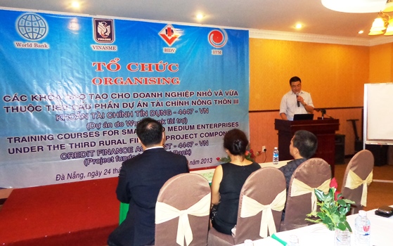 (VINASME) – Từ ngày 24 đến ngày 29 tháng 9 năm 2013 tại TP Đà Nẵng, Hiệp hội doanh nghiệp nhỏ và vừa (DNNVV) Việt Nam, Viện Đào tạo Công nghệ và Quản lý quốc tế (IITM), Ngân hàng BIDV, Hiệp hội doanh nghiệp nhỏ và vừa TP Đà Nẵng đã phối hợp tổ chức 02 khóa đào tạo cho các doanh nghiệp nhỏ và vừa (SMEs) với các chuyên đề: Quản trị Doanh nghiệp cho SME hoạt động trong nền kinh tế thị trường toàn cầu và Quản trị Tài Chính Doanh nghiệp và Quản trị rủi ro kinh doanh cho SMEs.