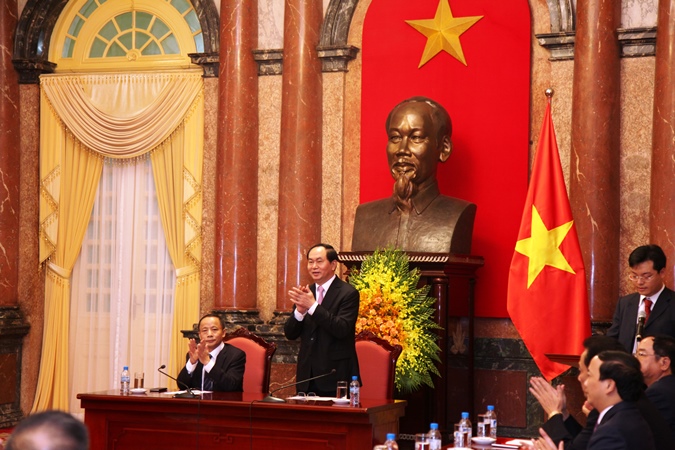 Chiều 25/10, tại Phủ Chủ tịch, Chủ tịch nước Trần Đại Quang đã có buổi gặp mặt và nói chuyện với Đoàn đại biểu doanh nghiệp nhỏ và vừa tiêu biểu nhân dịp kỷ niệm 12 năm Ngày Doanh nhân Việt Nam.