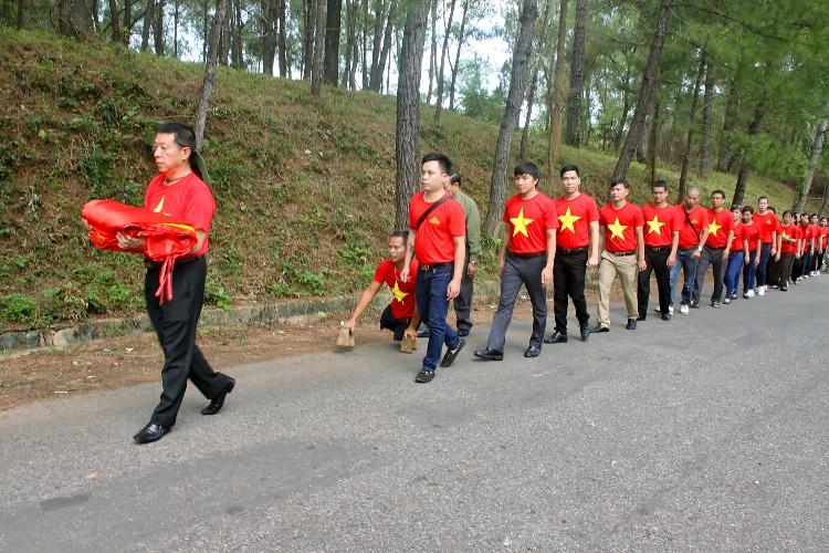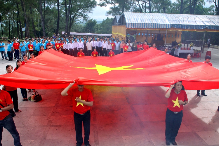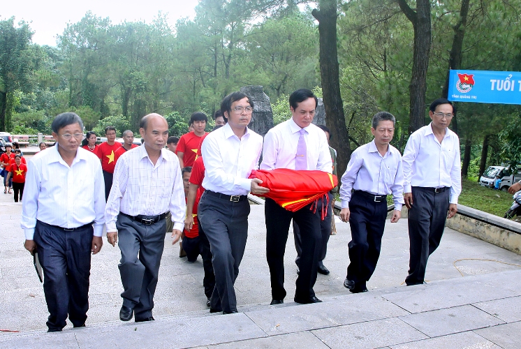 Đồng chí Lê Bá Trình - Phó Chủ tịch Ủy ban Trung ương Mặt trận Tổ quốc Việt Nam và đồng chí Tô Hoài Nam - Phó Chủ tịch kiêm Tổng Thư ký Hiệp hội DNNVV Việt Nam rước cờ đặt tại Đài tưởng niệm của Nghĩa trang liệt sỹ Trường Sơn.