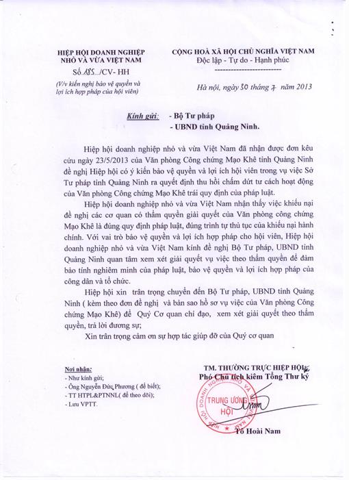 Hiệp hội doanh nghiệp nhỏ và vừa Việt Nam đã nhận đơn kêu cứu ngày 23/5/2013 của Văn phòng Công chứng Mạo Khê tỉnh Quảng Ninh. Sau khi nghiên cứu, Hiệp hội có văn bản kiến nghị như sau: