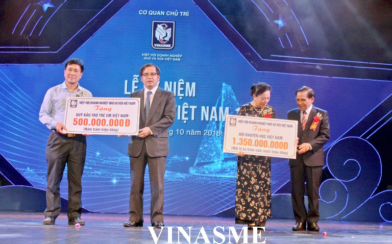 Đồng chí Tô Hoài Nam - Phó Chủ tịch Thường trực kiêm Tổng thư ký Hiệp hội Doanh nghiệp nhỏ và vừa Việt Nam trao 1 tỷ 350 triệu đồng cho Quỹ học bổng Hội Khuyến học Việt Nam; 500.000.000 đồng cho Quỹ Bảo trợ trẻ em Việt Nam.