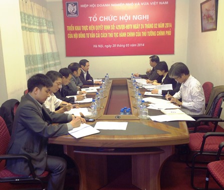 (VINASME) – Ngày 28/3/2014 tại Hội trường số 01, Hiệp hội doanh nghiệp nhỏ và vừa (DNNVV) Việt Nam tổ chức Hội nghị triển khai thực hiện Quyết định số: 429/QĐ-HĐTV ngày 24 tháng 02 năm 2014 của Hội đồng cải cách thủ tục hành chính (CCTTHC) của Thủ tướng Chính phủ.