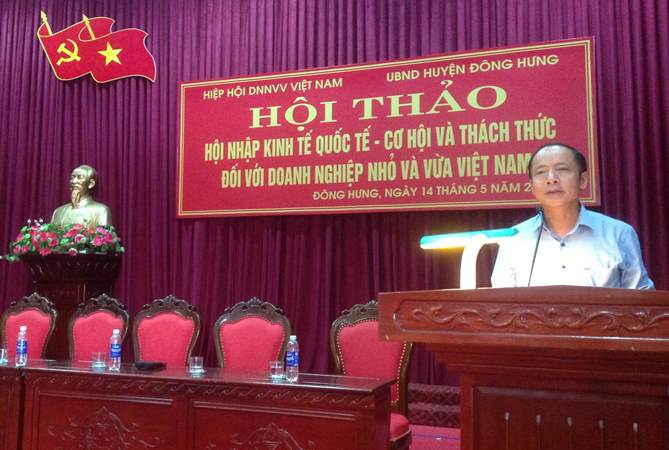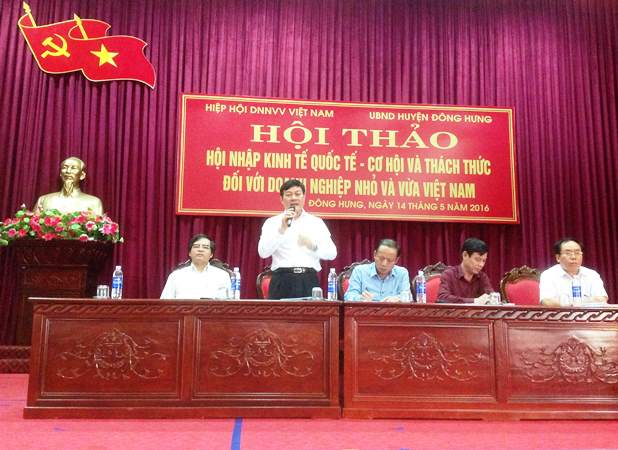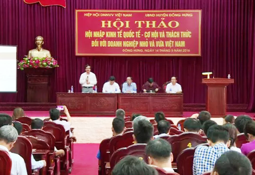 (VINASME) – Sáng 14/5/2016 tại Trung tâm Văn hóa thể thao huyện Đông Hưng, tỉnh Thái Bình, Hiệp hội Doanh nghiệp nhỏ và vừa (DNNVV) Việt Nam phối hợp với UBND huyện tổ chức Hội thảo “Hội nhập kinh tế Quốc tế - Cơ hội và thách thức đối với Doanh nghiệp nhỏ và vừa Việt Nam”.