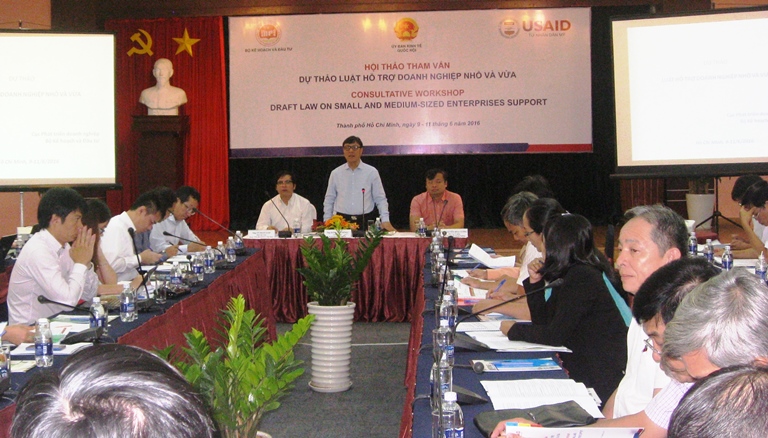 (VINASME) - Trong 3 ngày từ ngày 9/6 đến 11/6 năm 2016 tại Tp Hồ Chí Minh, được sự hỗ trợ của dự án Quản trị Nhà nước nhằm tăng trưởng toàn diện (USAID – Hoa Kỳ). Bộ Kế hoạch và Đầu tư, Ủy ban kinh tế Quốc hội chủ trì phối hợp với Hiệp hội Doanh nghiệp nhỏ và vừa Việt Nam tổ chức Hội thảo Tham vấn các Đoàn đại biểu quốc hội, các cơ quan Nhà nước và cộng đồng doanh nghiệp nhỏ và vừa tại khu vực phía Nam đối với dự án Luật Hỗ trợ doanh nghiệp nhỏ và vừa.