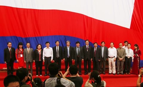 Các đại biểu chụp ảnh lưu niệm dưới lá cờ Đại Lễ lớn nhất Việt Nam