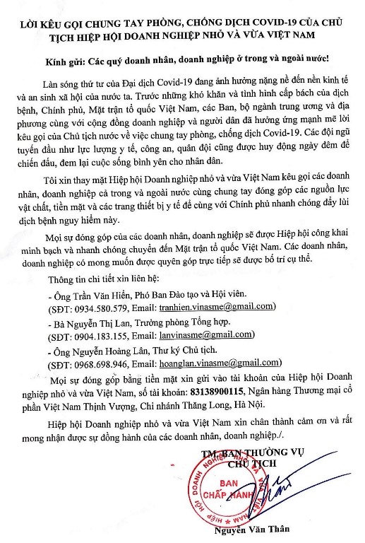 Chủ tịch Hiệp hội Doanh nghiệp nhỏ và vừa Việt Nam Nguyễn Văn Thân kêu gọi các doanh nhân, doanh nghiệp cả trong và ngoài nước cùng chung tay đóng góp các nguồn lực vật chất, tiền mặt và các trang thiết bị y tế để cùng Chính phủ nhanh chóng đẩy lùi dịch bệnh COVID-19.