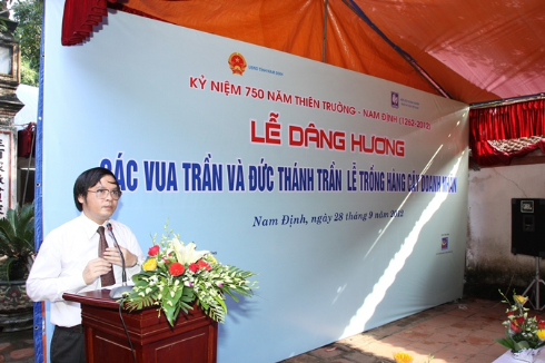 Hôm nay, trong không khí uy linh của những ngày tháng tám, ngày giỗ Đức thánh Trần và kỷ niệm các vua Trần, cùng với các hoạt động thiết thực của Đảng Bộ, Quân và dân tỉnh Nam Định chào mừng kỷ niệm 750 năm Thiên Trường – Nam Định(1262-2012). Cộng đồng Doanh nghiệp (DN) chúng ta họp mặt tại đây, để tổ chức Lễ Dâng hương các Vua Trần và Đức thánh Trần, tổ chức trồng hàng cây Doanh nhân Việt Nam trên vùng đất thiêng, nơi phát tích của Vương Triều Trần, di tích lịch sử văn hóa quốc gia đặc biệt: Đền Trần, phường Lộc Vượng, tp Nam Định.