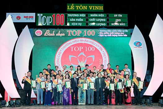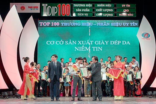 Đồng chí Tô Hoài Nam và đồng chí Chu Văn Yêm trao biểu tượng cho doanh nhân, doanh nghiệp đạt danh hiệu TOP 100 thương hiệu – nhãn hiệu uy tín.