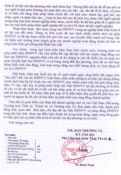 Vinasme xin trích nguyên văn nội dung Công văn số 104/CV-BTVHH.
