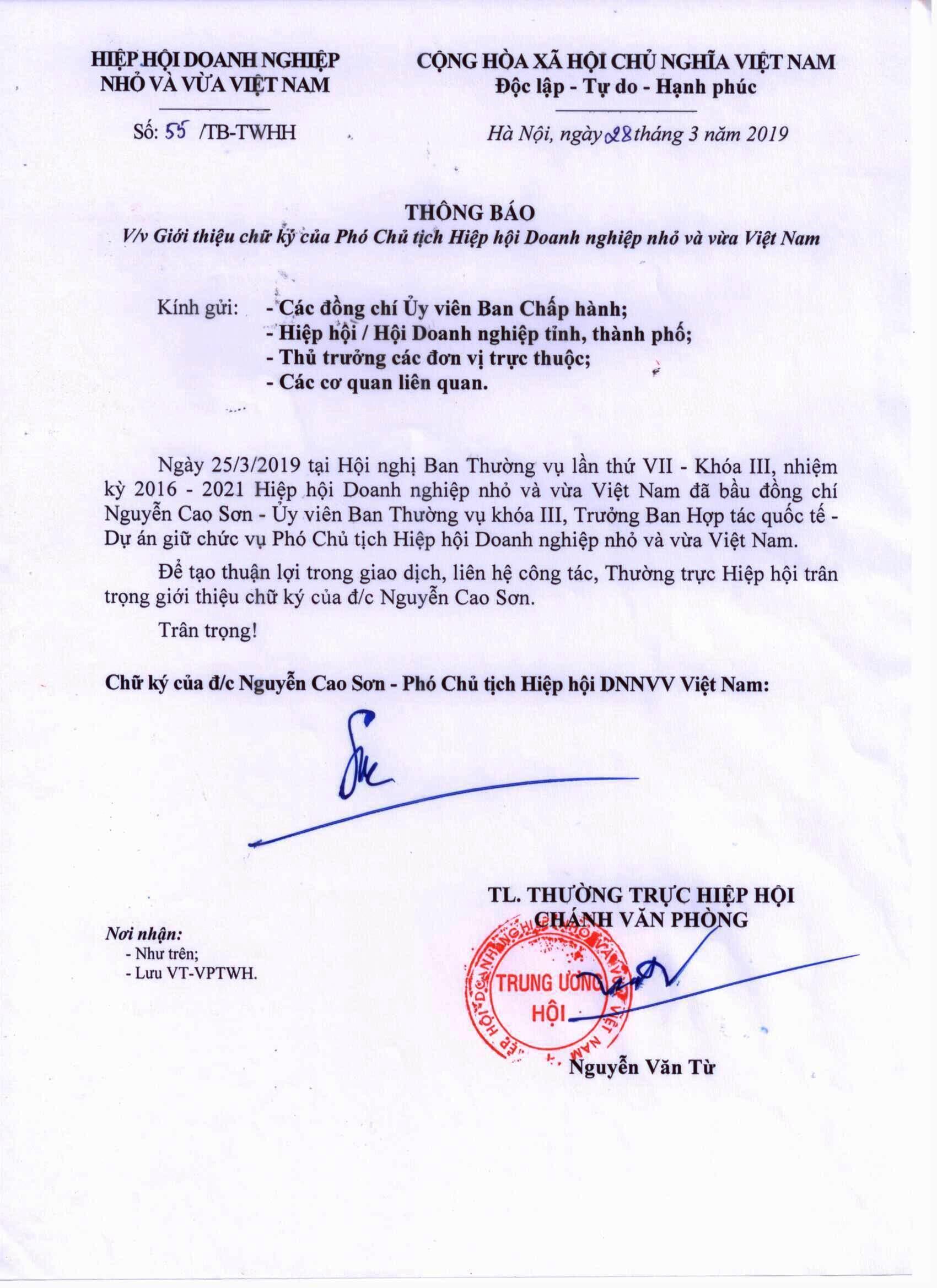 Thông báo chức danh và giới thiệu chữ ký của Phó Chủ tịch Hiệp hội Doanh nghiệp nhỏ và vừa Việt Nam