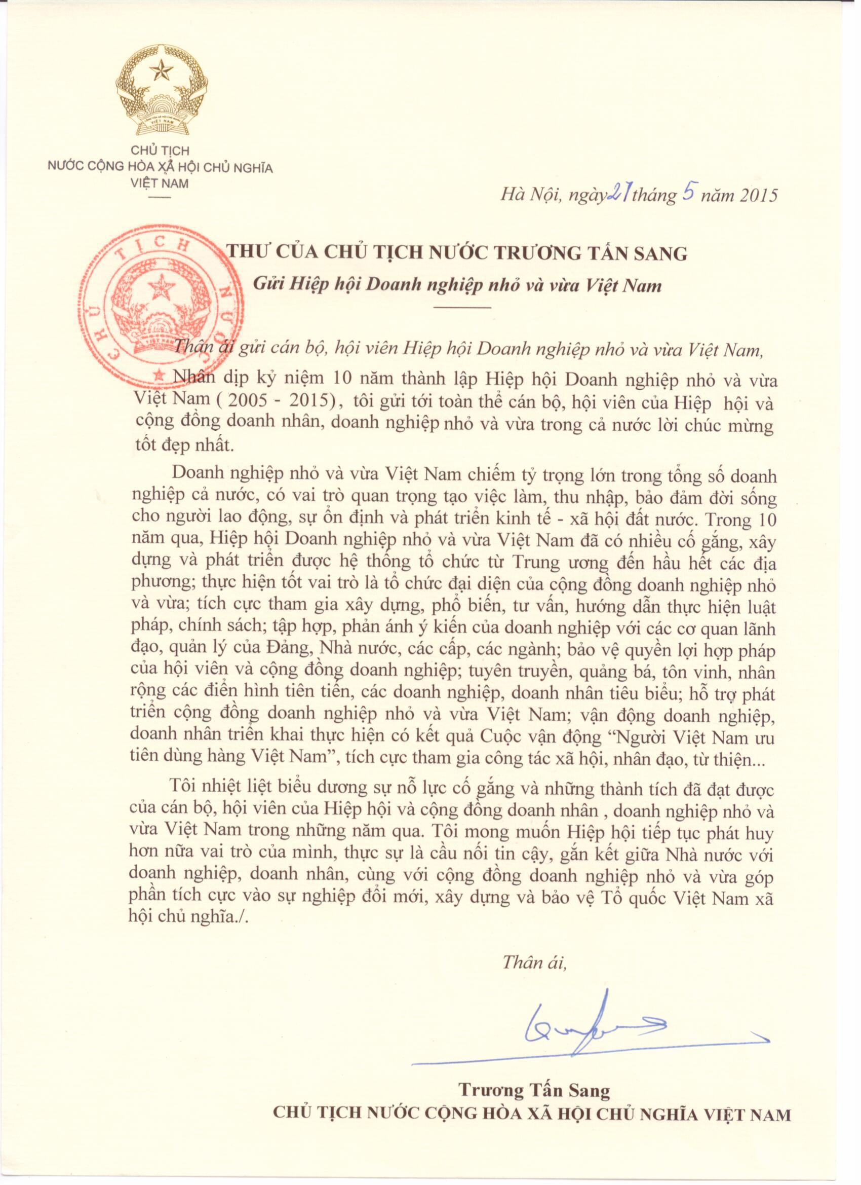 Ngày 27 tháng 5 năm 2015, Chủ tịch nước Trương Tấn Sang đã có thư gửi Hiệp hội Doanh nghiệp nhỏ và vừa Việt Nam.