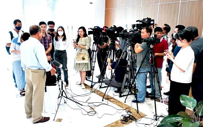 Các cơ quan báo chí, truyền hình phỏng vấn chuyên gia tham dự hội nghị.