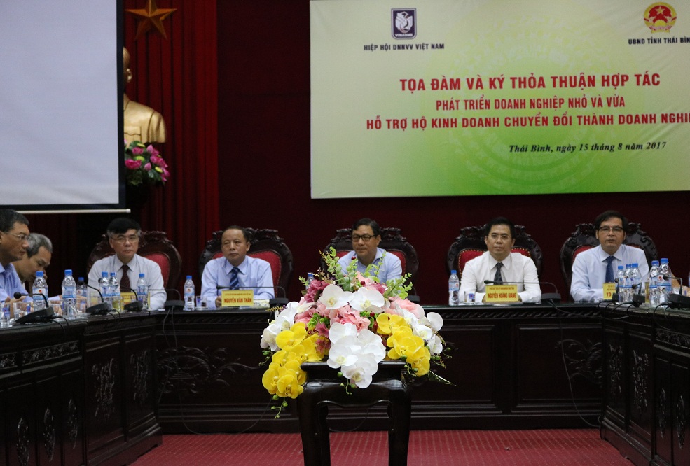 Buổi tọa đàm ngoài đại diện lãnh đạo VINASME và tỉnh Thái Bình còn có Thứ trưởng Bộ Kế hoạch và Đầu tư Đặng Huy Đông, nguyên Phó Chủ nhiệm Ủy ban kinh tế của Quốc hội Nguyễn Văn Phúc.Phát biểu mở đầu tại buổi tọa đàm, ông Nguyễn Hoàng Giang - Phó Chủ tịch tỉnh Thái Bình cho biết, toàn tỉnh có khoảng 5.400 doanh nghiệp với vốn đăng ký gần 48.000 tỷ đồng, có 640 chi nhánh, văn phòng đại diện.Ông Giang cũng cho biết, thời gian qua, tỉnh Thái Bình đặt quyết tâm rất cao trong việc tạo điều kiện thuận lợi, hỗ trợ cộng đồng doanh nghiệp trên địa bàn phát triển lớn mạnh, hỗ trợ các hộ sản xuất kinh doanh cá thể đủ điều kiện nâng cấp mô hình hoạt động thành doanh nghiệp.Trong khi đó, Chủ tịch Hiệp hội doanh nghiệp nhỏ và vừa Việt Nam Nguyễn Văn Thân cho biết: "Là tổ chức đại diện cho cộng đồng doanh nghiệp nhỏ và Việt Nam, thông qua tỉnh, VINASME sẽ hỗ trợ các doanh nghiệp trên địa bàn về cả nhân lực và các tư vấn thủ tục pháp lý thành lập doanh nghiệp, cũng như việc kết nối các các Bộ ngành, cơ quan chức năng, ngân hàng về việc tiếp cận vốn để phục vụ sản xuất kinh doanh".Nêu tham luận tại buổi tọa đàm, Thứ trưởng Đặng Huy Đông thừa nhận các hộ kinh doanh muốn lên doanh nghiệp nhưng vẫn còn khó khăn do thiếu nguồn vốn. Ông cho biết sẽ tham vấn với cấp trên để gỡ vướng mắc này.Ông Phan Đức Hiếu – Phó Viện trưởng Viện Nghiên cứu Quản lý kinh tế Trung ương chia sẻ về khung pháp luật và chính sách liên quan việc hộ kinh doanh chuyển đổi thành doanh nghiệp.Đại diện một hộ kinh doanh ở Thái Bình nêu thắc mắc trước việc chuyển đổi thành doanh nghiệp. Lo ngại chủ yếu vẫn là nguồn vốn và việc vay vốn để phục vụ sản xuất kinh doanh.Tư vấn cho các hộ kinh doanh, Phó chủ tịch thường trực kiêm Tổng thư ký VINASME Tô Hoài Nam cho biết, thủ tục pháp lý để các hộ kinh doanh tiếp cận vốn ngân hàng hiện tương đối dễ dàng, chỉ cần chứng minh được khả năng trả nợ.Ông Nam cũng tiết lộ, vừa qua, VINASME và BIDV đã ký kết hợp tác và phía BIDV cam kết cung cấp gói tín dụng 10.000 tỷ để hỗ trợ các hộ kinh doanh, doanh nghiệp nhỏ và vừa.Ông Trần Trung Kiên - Phó giám đốc Ban khách hàng doanh nghiệp nhỏ và vừa của BIDV khẳng định sẽ tạo điều kiện cho các doanh nghiệp tiếp cận nguồn vốn. Theo ông Nguyễn Văn Phúc - Nguyên Phó chủ tịch Ủy ban kinh tế của Quốc hội, Trưởng nhóm tư vấn VINASME, với cam kết của BIDV và sự hỗ trợ của Hiệp hội doanh nghiệp nhỏ và vừa Việt Nam thì đây là cơ hội tốt để các hộ kinh doanh chuyển đổi thành doanh nghiệp.Ông Nguyễn Văn Từ (trái) - Chánh văn phòng VINASME tại buổi tọa đàm.Kết thúc tọa đàm, Chủ tịch Hiệp hội doanh nghiệp nhỏ và vừa Việt Nam Nguyễn Văn Thân một lần nữa cam kết giúp các hộ kinh doanh tự tin chuyển đổi lên doanh nghiệp, tiếp cận nguồn vốn phục vụ kinh doanh, hỗ trợ các doanh nghiệp nhỏ và vừa tự tin sản xuất kinh doanh.Ngay sau khi kết thúc tọa đàm, đại diện VINASME và UBND tỉnh Vĩnh Phúc đã ký kết thỏa thuận hợp tác về phát triển doanh nghiệp nhỏ và vừa, hỗ trợ kinh doanh chuyển đổi thành doanh nghiệp trên địa bàn tỉnh Thái Bình.Đại diện VINASME và UBND tỉnh Thái Bình ký kết hợp tác dưới sự kiến của đại diện các Ban, Bộ, ngành...