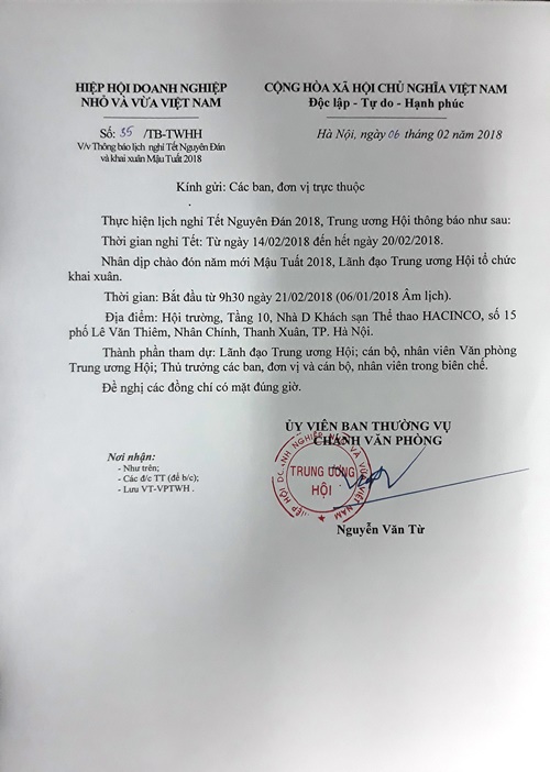 Văn phòng Trung ương Hội thông báo lịch nghỉ Tết Nguyên Đán và khai xuân Mậu Tuất 2018