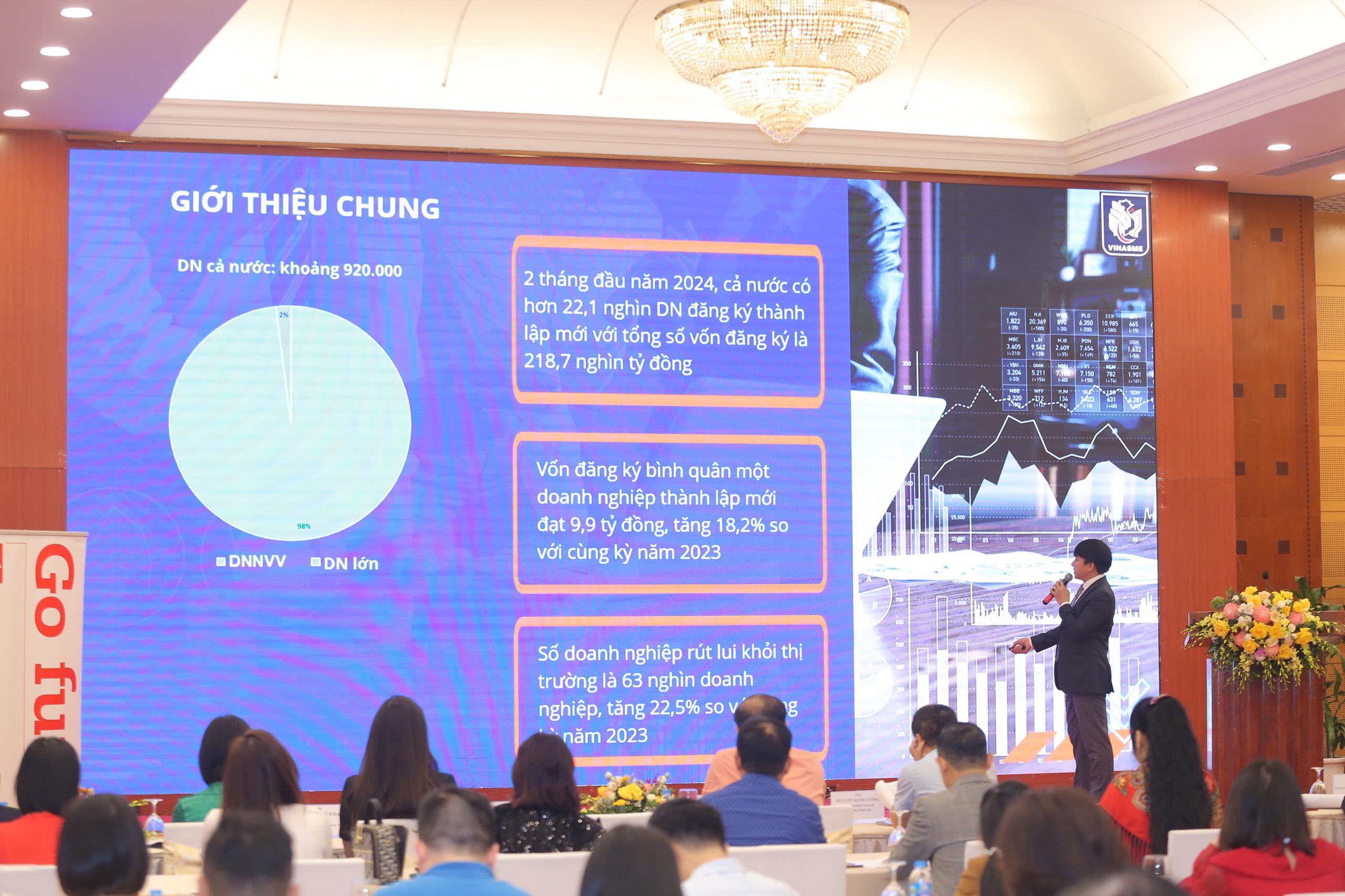 Thay mặt nhóm nghiên cứu, Ths. Trần Văn Hiển – Phó Trưởng Ban Đào tạo và hội viên VINASME đã cung cấp một số thông tin cụ thể là: Hiện cả nước có khoảng 920.000 doanh nghiệp. Trong đó, DNNVV chiếm 98%. 2 tháng đầu năm 2024, cả nước có hơn 22,1 nghìn doanh nghiệp đăng ký thành lập mới với tổng số vốn đăng ký là 218,7 nghìn tỷ đồng. Vốn đăng ký bình quân một doanh nghiệp thành lập mới đạt 9,9 tỷ đồng, tăng 18,2% so với cùng kỳ năm 2023. Số doanh nghiệp rút lui khỏi thị trường là 63.000 doanh nghiệp, tăng 22,5% so với cùng kỳ năm 2023.
