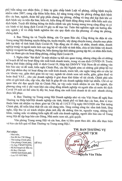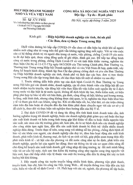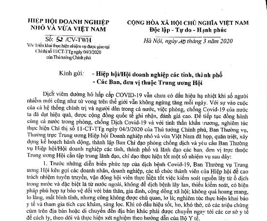 Ngày 10 tháng 03 năm 2020, Hiệp hội Doanh nghiệp nhỏ và vừa Việt Nam đã tổ chức cuộc họp triển khai Chỉ thị 11/CT-TTg ngày 04 tháng 03 năm 2020 của Thủ tướng Chính phủ về các nhiệm vụ, giải pháp cấp bách tháo gỡ khó khăn cho sản xuất kinh doanh, bảo đảm an sinh xã hội ứng phó với dịch Covid 19 dưới sự chủ trì của đồng chí Nguyễn Văn Thân – Chủ tịch Hiệp hội.