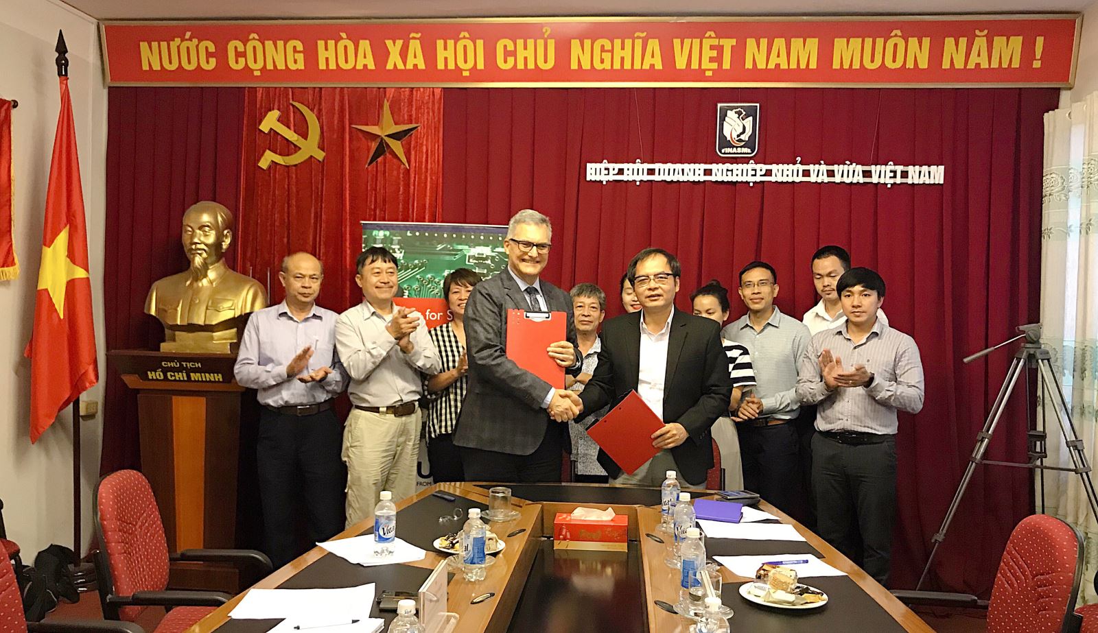 Thay mặt lãnh đạo VINASME, ông Tô Hoài Nam - Phó Chủ tịch Thường trực kiêm Tổng thư ký và ông Ron Askin - Giám đốc Dự án Liên kết doanh nghiệp LinkSME của USAID đã đặt bút ký chương trình hợp tác nhằm hỗ trợ cộng đồng DNNVV Việt Nam tham gia vào chuỗi giá trị toàn cầu.