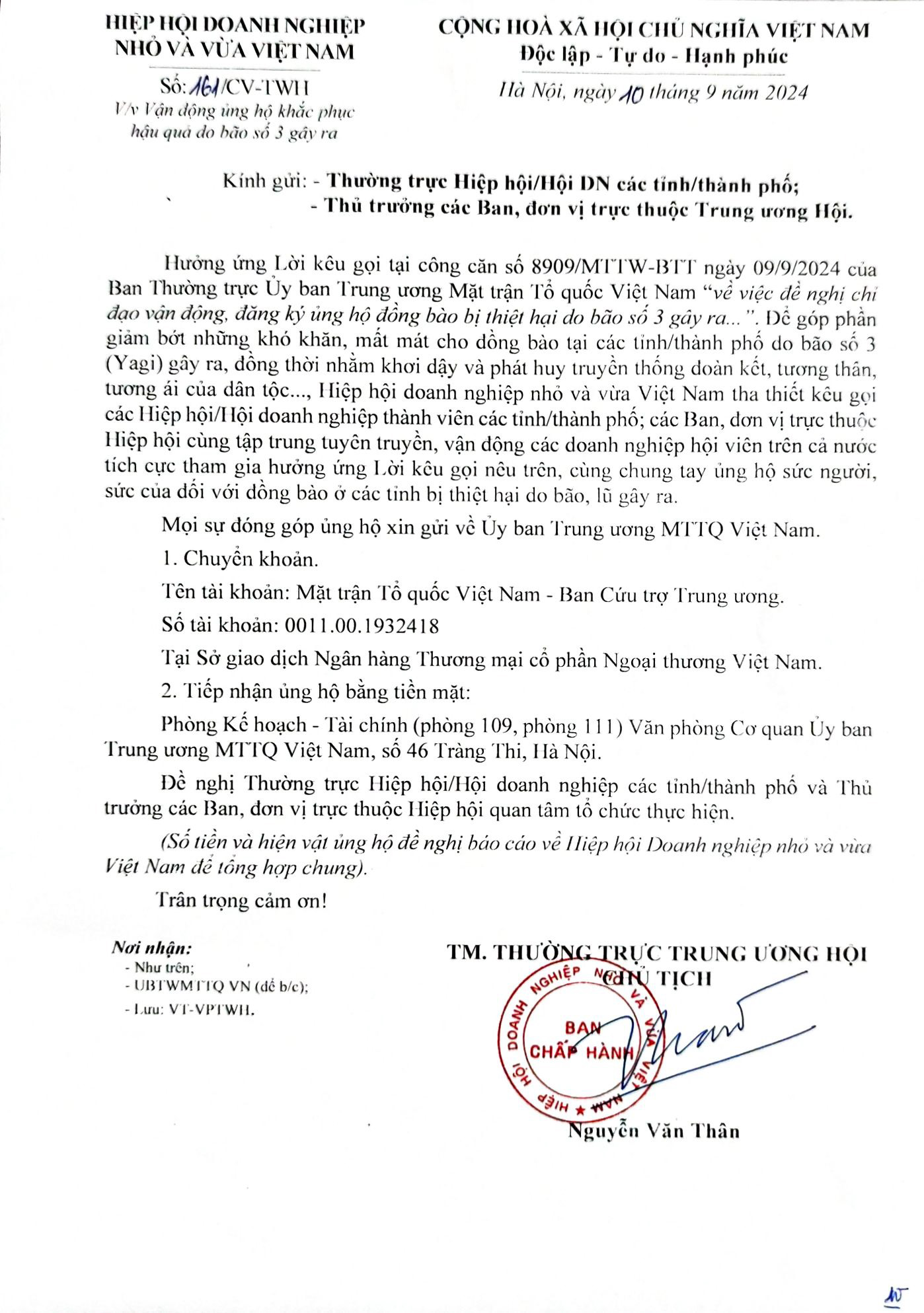 Hưởng ứng Lời kêu gọi tại công căn số 8909/MTTW-BTT ngày 09/9/2024 của Ban Thường trực Ủy ban Trung ương Mặt trận Tổ quốc Việt Nam “về việc đề nghị chỉ đạo vận động, đăng ký ủng hộ đồng bào bị thiệt hại do bão số 3 gây ra…”. Để góp phần giảm bớt những khó khăn, mất mát cho đồng bào tại các tỉnh/thành phố do bão số 3 (Yagi) gây ra, đồng thời nhằm khơi dậy và phát huy truyền thống đoàn kết, tương thân, tương ái của dân tộc…, Hiệp hội doanh nghiệp nhỏ và vừa Việt Nam tha thiết kêu gọi các Hiệp hội/Hội doanh nghiệp thành viên các tỉnh/thành phố; các Ban, đơn vị trực thuộc Hiệp hội cùng tập trung tuyên truyền, vận động các doanh nghiệp hội viên trên cả nước tích cực tham gia hưởng ứng Lời kêu gọi nêu trên, cùng chung tay ủng hộ sức người, sức của đối với đồng bào ở các tỉnh bị thiệt hại do bão, lũ gây ra.