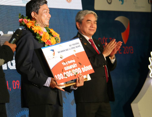 Ông Nguyễn Quân – Bộ trưởng Bộ khoa học và công nghệ trao giải nhất cuộc thi sáng tạo cho sản phẩm máy gặt đập liên hợp.