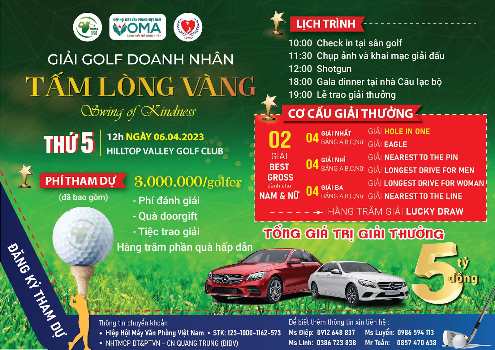 Giải golf Doanh nhân Tấm lòng vàng – Swing of kindness do Hiệp hội Máy văn phòng Việt Nam, Hội bảo trợ người khuyết tật và trẻ em mồ côi Việt Nam phối kết hợp tổ chức.