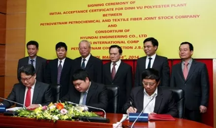 Lễ ký Chứng chỉ Nghiệm thu sơ bộ Nhà máy Polyester Đình Vũ sáng 14/3/2014 với sự tham dự của ông Vũ Đình Duy (ngồi giữa. Ảnh: Hoàng Tuấn.