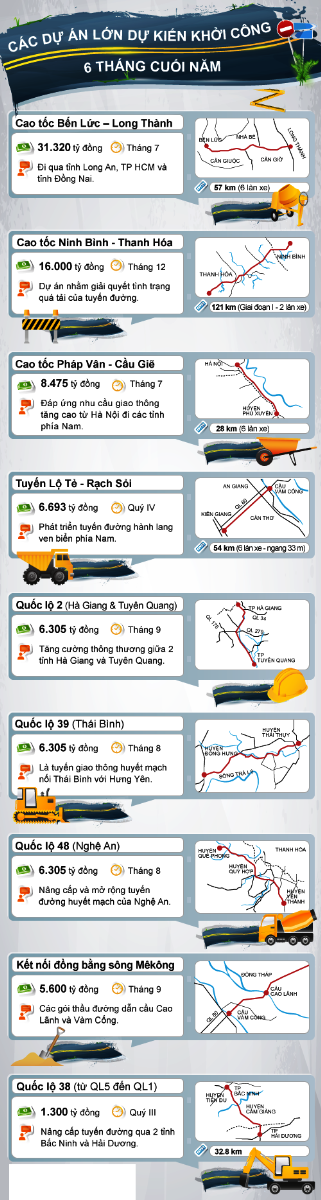 Cao tốc Bến Lức - Long Thành, Ninh Bình - Thanh Hóa, Pháp Vân - Cầu Giẽ... cùng hàng chục dự án khác sẽ được khởi công trong thời gian tới.