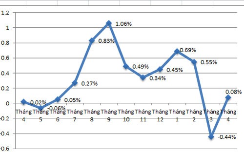 Sau khi giảm mạnh vào tháng 3, tháng 4 này, chỉ số giá tiêu dùng (CPI) đã tăng 0,08% so với tháng trước và tăng 4,45% so với cùng tháng năm trước.