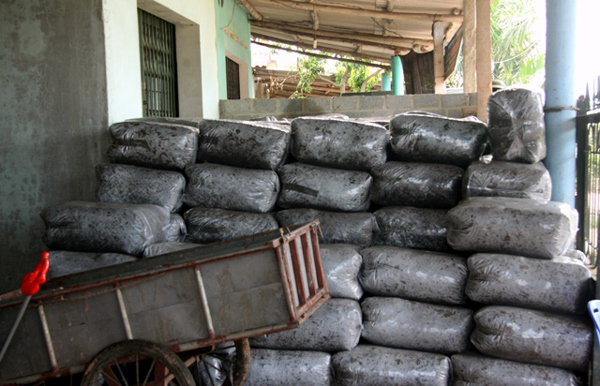 Bên phía Nhật đã đầu tư cho gia đình anh H. dây chuyền máy cắt, ép, nén để đóng lá vải mục vào các túi ni-lon. Một túi ni-lon ép chặt nặng 25kg.