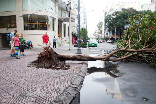 Chiều 17/8, cơn mưa lớn kèm giông mạnh khiến hàng loạt cây cổ thụ ở trung tâm TP HCM bật gốc. Một gia đình đi xe máy đến giao lộ Nguyễn Bỉnh Khiêm - Nguyễn Thị Minh Khai bị cây đè trúng làm người vợ tử vong.