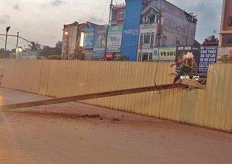 Cũng theo nhân chứng trên, thời điểm thanh sắt rơi, 1 đầu nằm chắn ngang gần hết 1 làn đường xe lưu thông; còn đầu kia “xé toạc” 1 đoạn tấm rào chắn bằng tôn và vẫn gác lên đó. Chỉ trong “nháy mắt” công nhân đã vội vã thu dọn hiện trường và cho người “vá” ngay tấm tôn rào chắn bị rách.