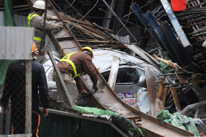 Chiếc taxi bị sắt thép, bê tông đè bẹp, nằm kẹt trong đống đổ nát trên đường Trần Phú. Hai xe cẩu cùng hàng chục công nhân cấp tập tháo dỡ vật liệu, giải phóng hiện trường.