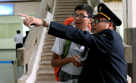 Nhân viên bến xe hướng dẫn cho một khách du lịch người nước ngoài.