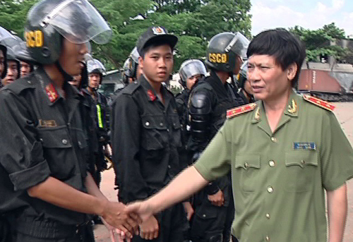 | Trung tướng Hoàng Kông Tư thăm và động viên lực lượng Cảnh sát cơ động Bộ Công an làm nhiệm vụ ở Bình Dương. Ảnh: Nguyệt Triều |