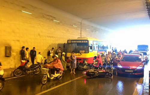 Hơn 14h chiều 31/10, dòng xe đang dừng đỗ mặc áo mưa dưới hầm Kim Liên theo chiều về Đại Cồ Việt (Đống Đa, Hà Nội) thì bất ngờ xe buýt số 35 chạy tuyến Trần Khánh Dư - Mê Linh lao vào. Nhiều người hoảng loạn tháo chạy.