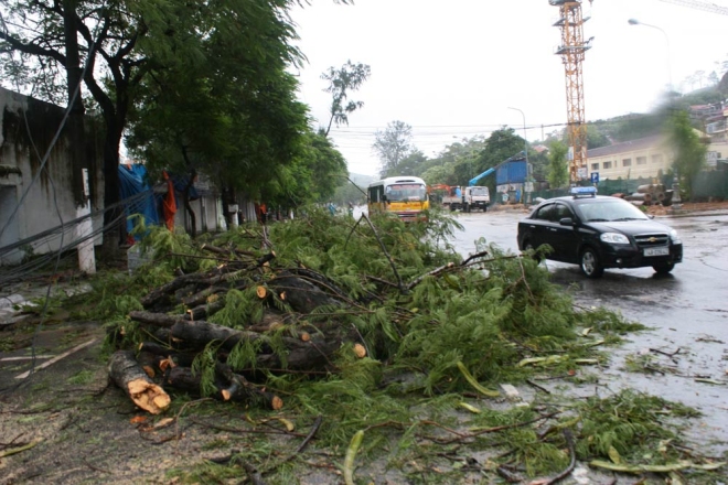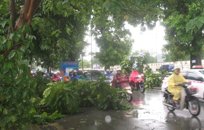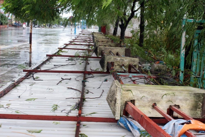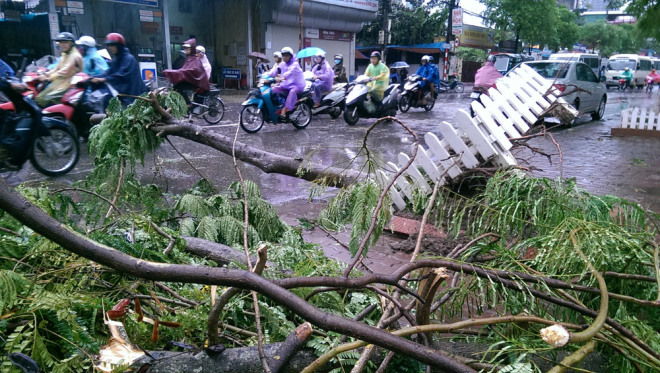 Bão quật đổ nhiều cây xanh, rào chắn trên các đường phố.