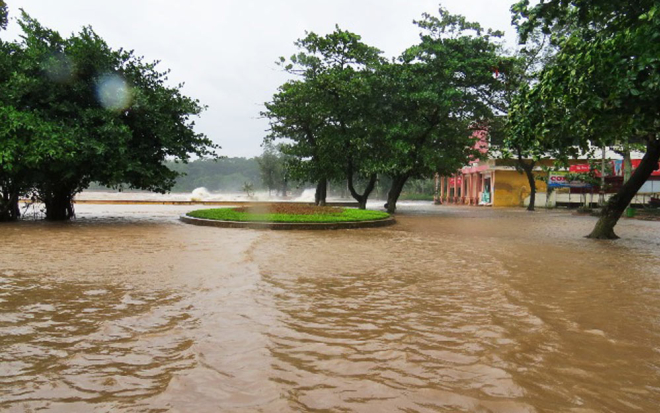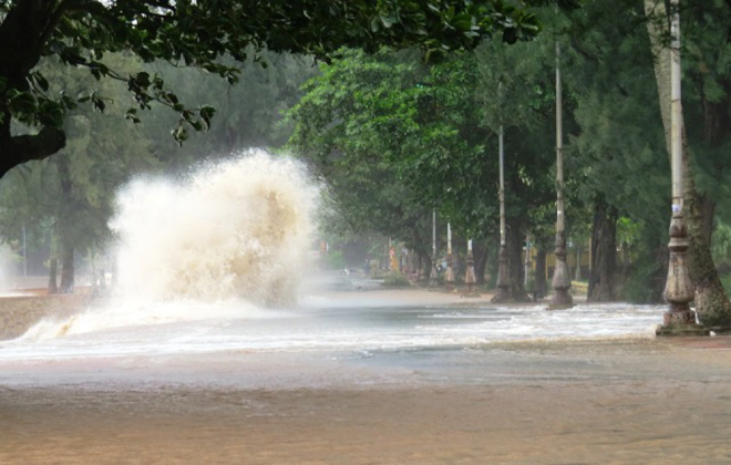 Nước biển đã làm ngập toàn bộ tuyến đường tại khu 1 dài gần một km, tràn vào các nhà hàng, khách sạn và đang chảy ngược vào các khu dân cư của phường Ngọc Hải, quận Đồ Sơn.
