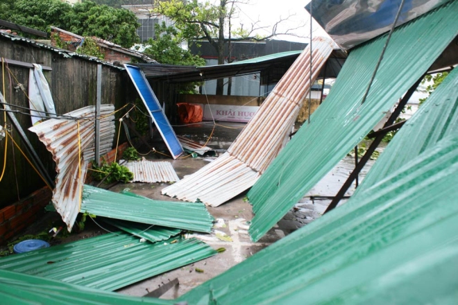Một tiếng sau khi đổ bộ vào Quảng Ninh, bão Kalmaegi đã quật đổ nhiều cây xanh, giật tung nhiều mái tôn của các nhà cao tầng.