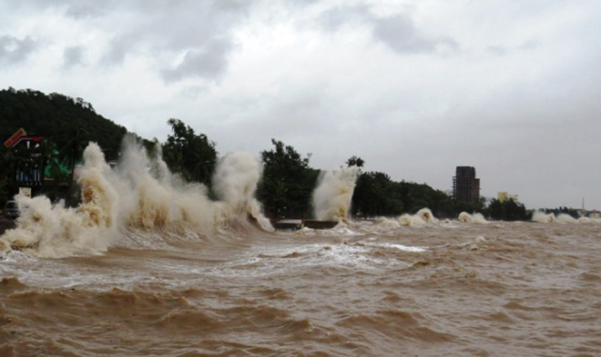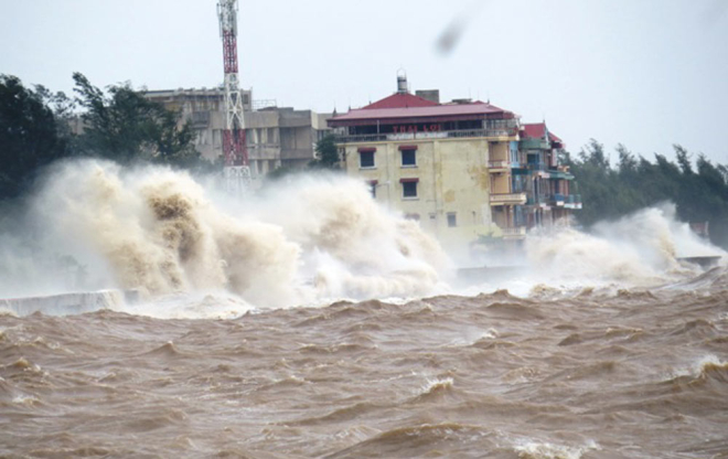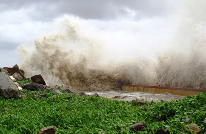 Những cột sóng đánh vào bờ kè ở quận Đồ Sơn, đẩy đất đá xô lên bờ.