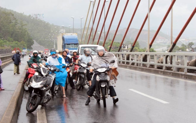 Lệnh cấm cầu Bãi Cháy được phát ra 20h30 đêm qua đến sáng nay đã dỡ bỏ, nhưng người dân vẫn chật vật khi qua cầu vì gió to.