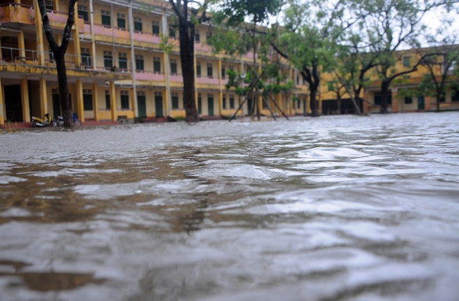 Toàn sân trường tiểu học Nguyễn Công Trứ (Tiền Hải, Thái Bình) bị ngập nước. Đêm qua ngập sâu đến 50-60 cm, nhưng đến sáng 17/9, nước đã rút còn khoảng 20-30 cm.