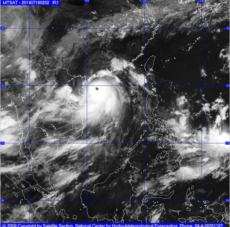 Theo Trung tâm dự báo Khí tượng Thủy văn Trung ương, hồi 10h ngày 18/7, vị trí tâm bão ở vào khoảng 19,4 độ Vĩ Bắc; 111,9 độ Kinh Đông, cách Móng Cái (Quảng Ninh) khoảng 510km về phía Đông Nam. Sức gió mạnh nhất ở vùng gần tâm bão mạnh cấp 14, cấp 15 (tức là từ 150 đến 183 km một giờ), giật cấp 16, cấp 17.