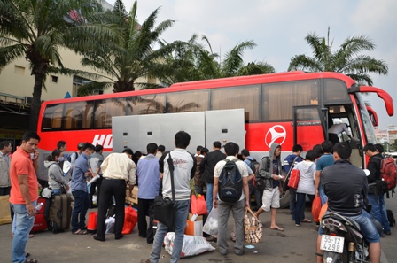 Ghi nhận tại quốc lộ 13, hàng ngàn phương tiện xếp hàng dài nhích từng chút một. Tương tự, tại đường Đinh Bộ Lĩnh đoạn trước cổng bến xe miền Đông, hàng trăm xe ô tô, gắn máy cũng nối đuôi nhau di chuyển khó khăn vào bến.Bên ngoài là vậy, bên trong bến xe cũng không khá hơn là mấy. Tất cả các hàng ghế dài trong sảnh dành cho hành khách ngồi chờ đã không đủ sức chứa do lượng người tập trung về đây mỗi lúc một đông. Người nào cũng tay xách, nách mang quà tết lỉnh kỉnh. Nỗi háo hức đoàn tụ gia đình hiện rõ trên khuôn mặt mỗi người. Rất nhiều người đã phải ngồi đợi ở ngoài cổng lẫn trong bến để có thể lên xe đúng giờ.