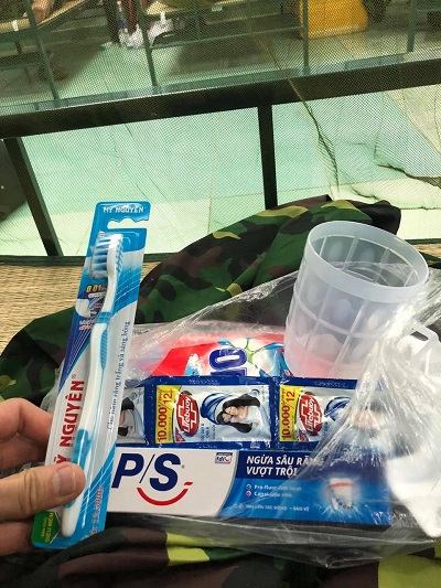 Sau khi kiểm tra thân nhiệt xong, chúng tôi được các chiến sỹ mời sang phòng ăn uống, sau đó được hướng dẫn về phòng nghỉ ngơi, theo đó các chiến sĩ trẻ không ngại ngần mang vác những chiếc vali vừa to vừa nặng lên tận tầng 5 cho phụ nữ và người lớn tuổi trong đoàn. Về phòng, chúng tôi được cấp phát đầy đủ đồ dùng thiết yếu như: Xà bông giặt, kem đánh răng, bàn chải, khăn mặt, dầu gội, nước muối súc miệng, nước uống đóng chai, nước bình, xô, chậu rửa mặt, chậu lớn tắm giặt…