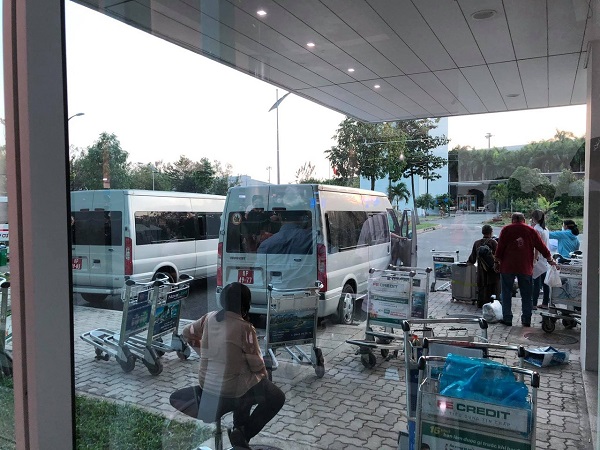 Xe chuyên dụng của quân đội chở mọi ngườì, trong đó có người nước ngoài về khu cách ly.