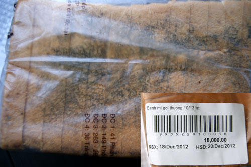 Kiểm tra nhãn mác trên bao nilon bọc bánh, bánh sản xuất ngày 18/12/2012, hạn sử dụng tới ngày 20/12/2012.
