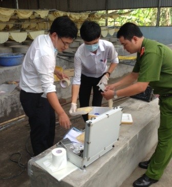 Cơ quan chức năng lấy mẫu các hóa chất để kiểm tra